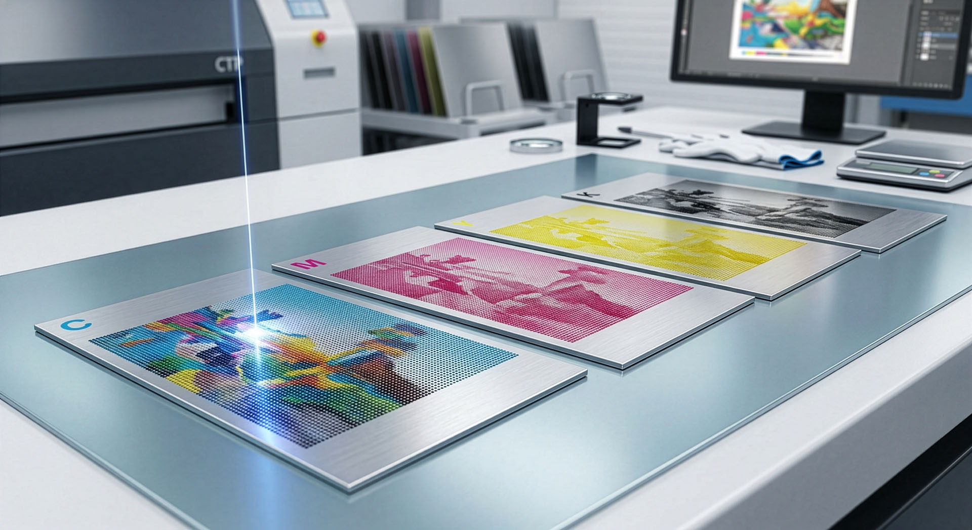 CTP(Computer to Plate)という機器を使い、データを直接アルミの刷版に焼き付けます。かつてはフィルムを経由していましたが、現在はデータから直接版を作るため、精度と速度が大幅に向上しています。