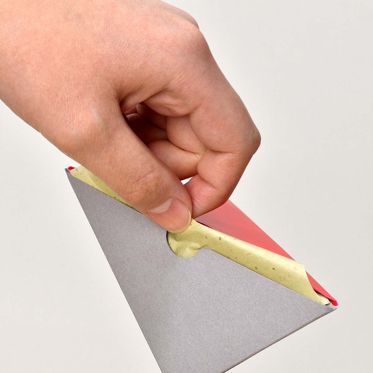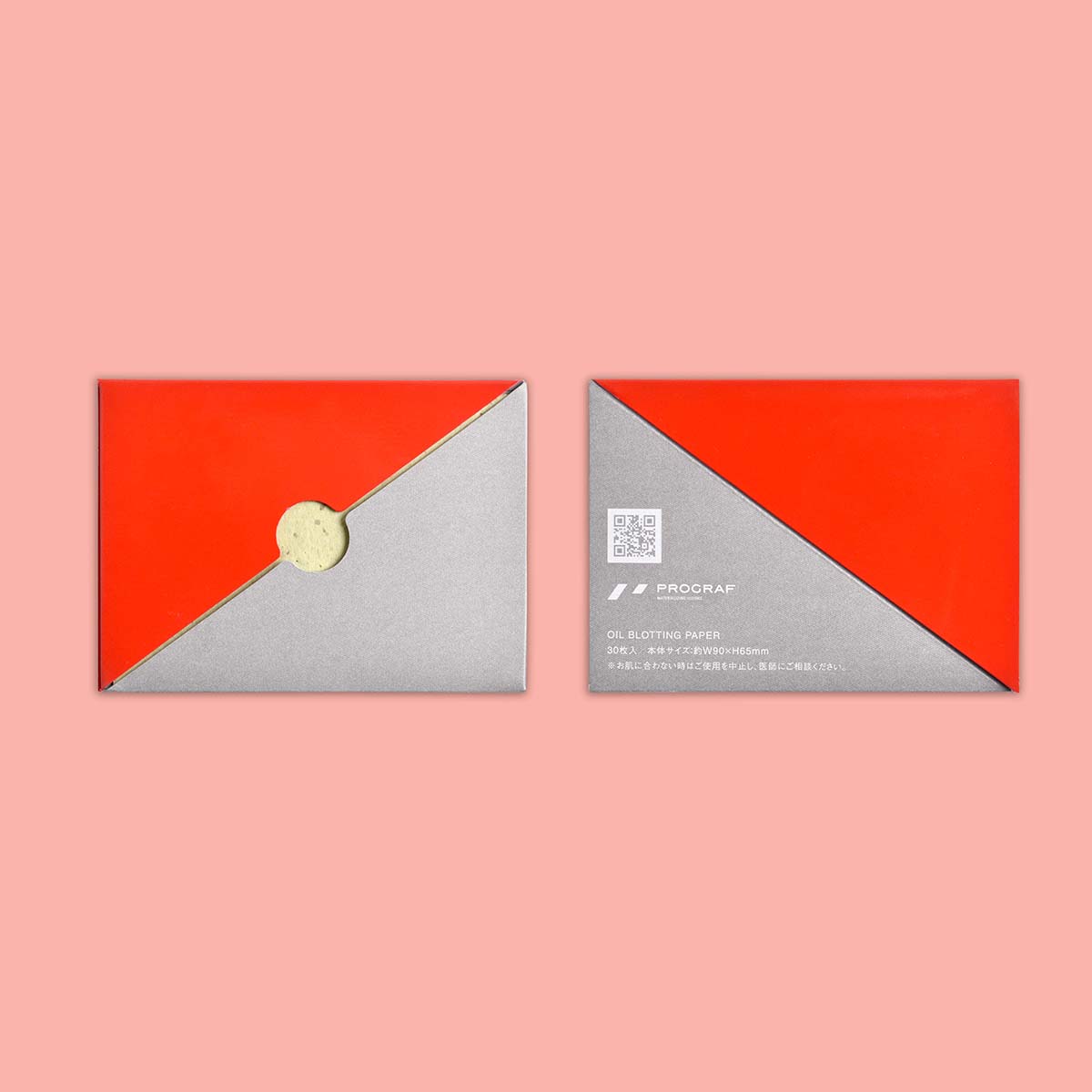 対角線で二つに折れ、そこからあぶらとりがみが取り出せる独自形状。